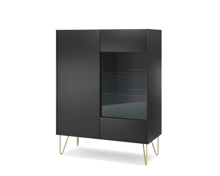 Nohy vitríny jsou vyrobeny z ohýbaného kovu, mají výšku 200 mm a jsou práškově lakované na zlatou barvu, což přidává moderní akcent. Dveře se otevírají pomocí hran, které přesahují přes desku, což eliminuje potřebu tradičních úchytů.
