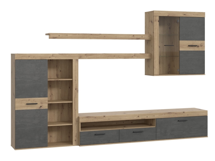 Obývací stěna Zumba ZMBM01L je funkční a moderní nábytkový set do obývacího pokoje, který spojuje styl a praktičnost. Skládá se ze čtyř částí: TV skříňky, vysoké stojací skříně, závěsné vitríny a dvou nástěnných polic. Celek tvoří elegantní kompozici, která se hodí jak do menších, tak větších interiérů.